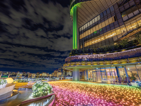 芝生エリアをフルカラーイルミネーションで彩り、周囲の植栽には白色の光で演出。