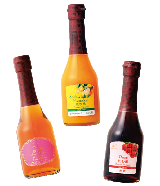 「からだにいいから」ではなく、「おいしいから」飲みたくなるのがオークスハートのビネガーの特徴です。通年人気の「シークヮーサーと八朔」(写真中央)は、甘酸っぱくてほろ苦く、飽きのこない味わい。仕事の合間にお湯割りで飲んで、リフレッシュしてください。国産桃の果実酢にぶどうの香りをプラスした「桃」(写真左)は、オン・ザ・ロックがおすすめ。この時季でしたら母の日の贈り物としても人気ですよ。薔薇の花びらをぶどう酢に漬け込み、さらにローズヒップの果実酢を合わせた「薔薇」(写真右)は、華やかで深みのある味わい。白ワインに少し加えるなどして、優雅なひとときをお過ごしいただけます。